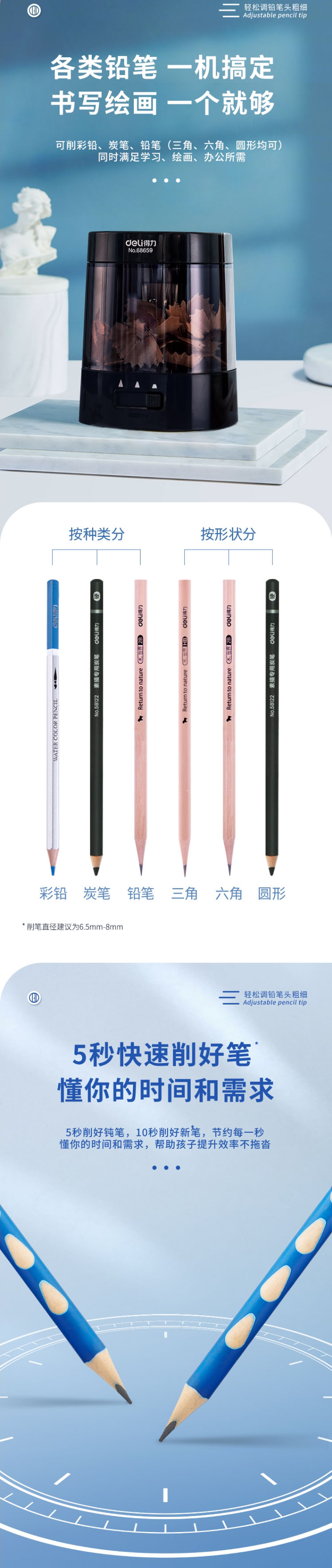 得力(deli)電動卷筆刀 粗細可調自動削筆器 多功能(néng)學(xué)生鉛筆刀 美術彩鉛削筆機 贈刀芯 黑色 68659